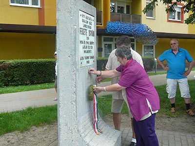 Eztán felkerestük az író emlékoszlopát, mely a volt gazdatiszti lak helyén lett felállítva. Itt elhelyeztük a megemlékezés virágait Fekete István író tiszteletére. A koszorút Szívek Éva titkár és Szollár András elnökségi tag helyezte el az emlékművön.